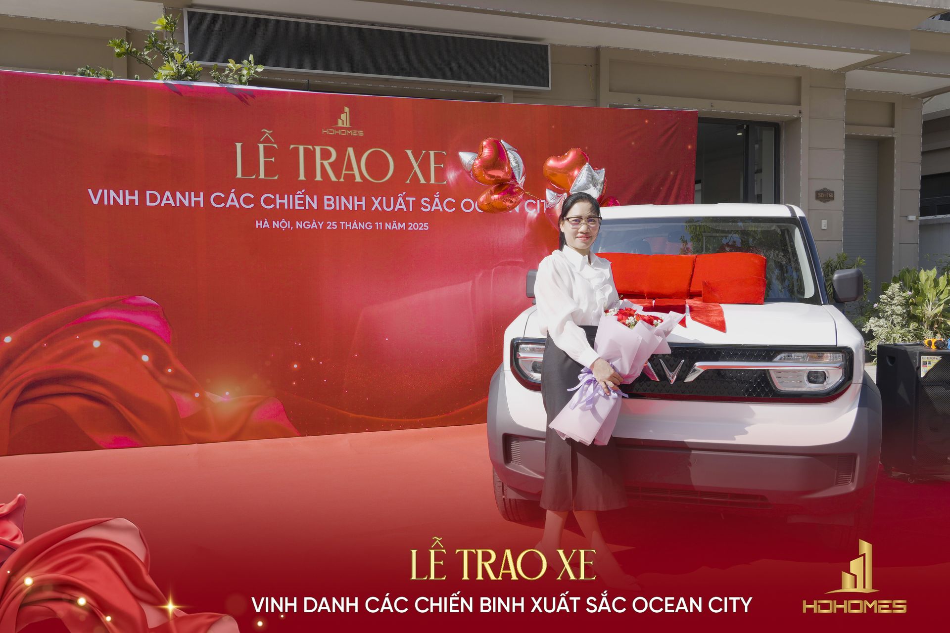 Tại buổi lễ, ông Mai Hồng Dương – Tổng Giám đốc HDHomes đã trực tiếp trao tặng 07 chiếc xe VF3 cho 07 chiến binh tiêu biểu, tạo nên một dấu ấn đầy tự hào và cảm xúc trong hành trình phát triển của HDHomes.